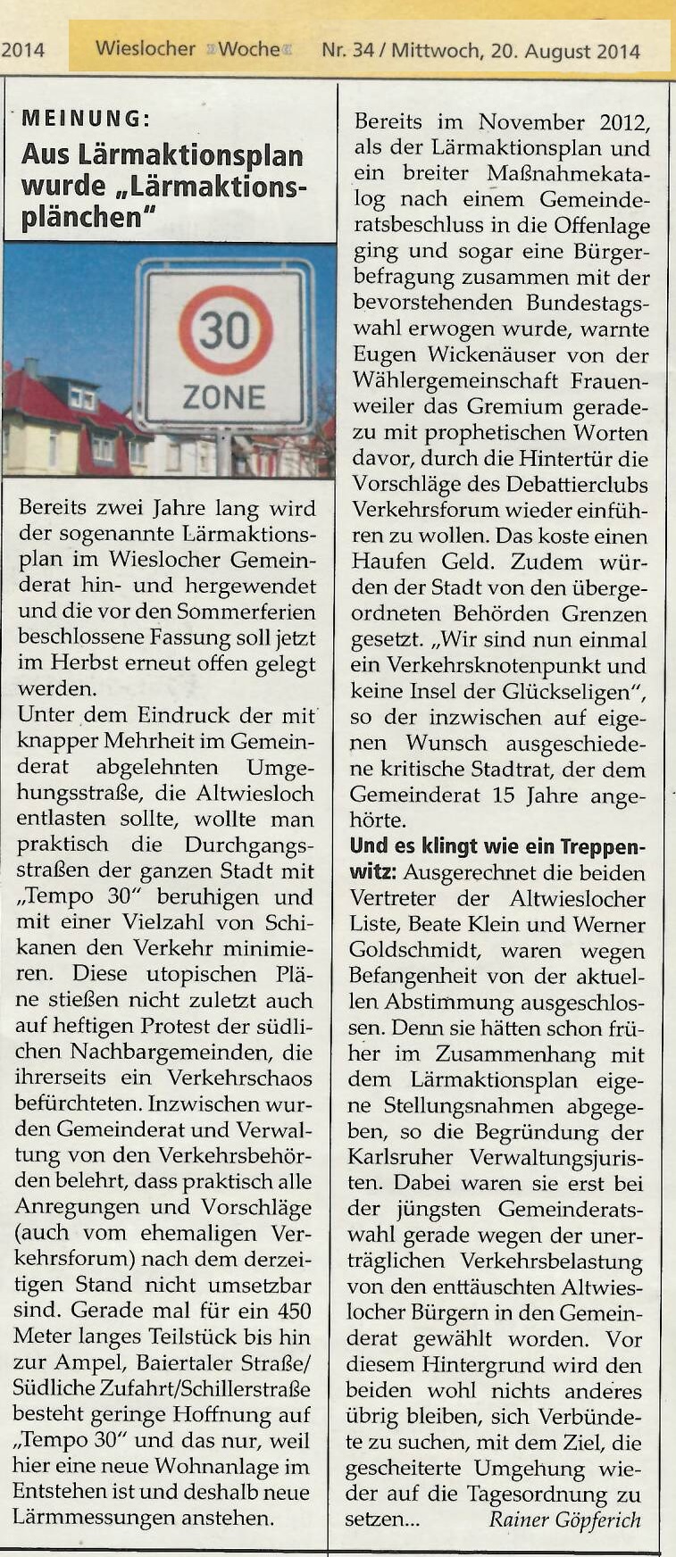 entstanden aus der unsäglichen Verkehrsbelastung bekommen wir 2 Mitglieder in den Rat, dürfen beim Lärmaktionsplan nicht mitberaten, geschweige denn mitbestimmen und es wird aus dem Plan ein Plänchen.