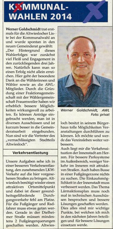 Für die Altwieslocher Liste sind im Stadtrat: Beate Klein und Werner Goldschmidt.
